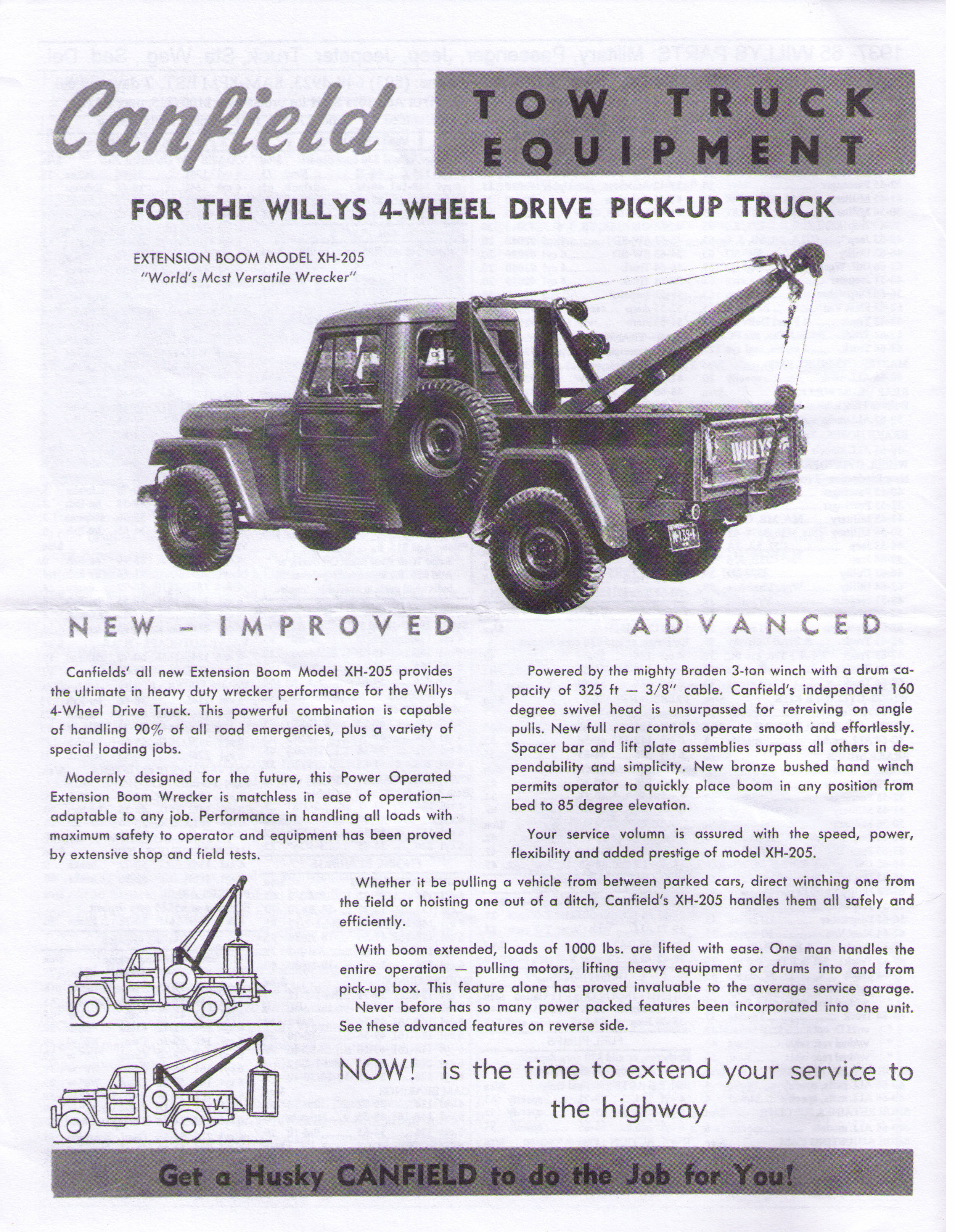 Here is a booklet about Canfield tow truck equipment. If your grand-father owned a garage it might had one of these. It was used on FC-150, FC-170, pickup truck and even on the CJ-5. I use to see it on FC truck. It mentioned that in less than 1 minute your pickup becomes a wrecker… Well, that is fast! I really like the push bumpers.