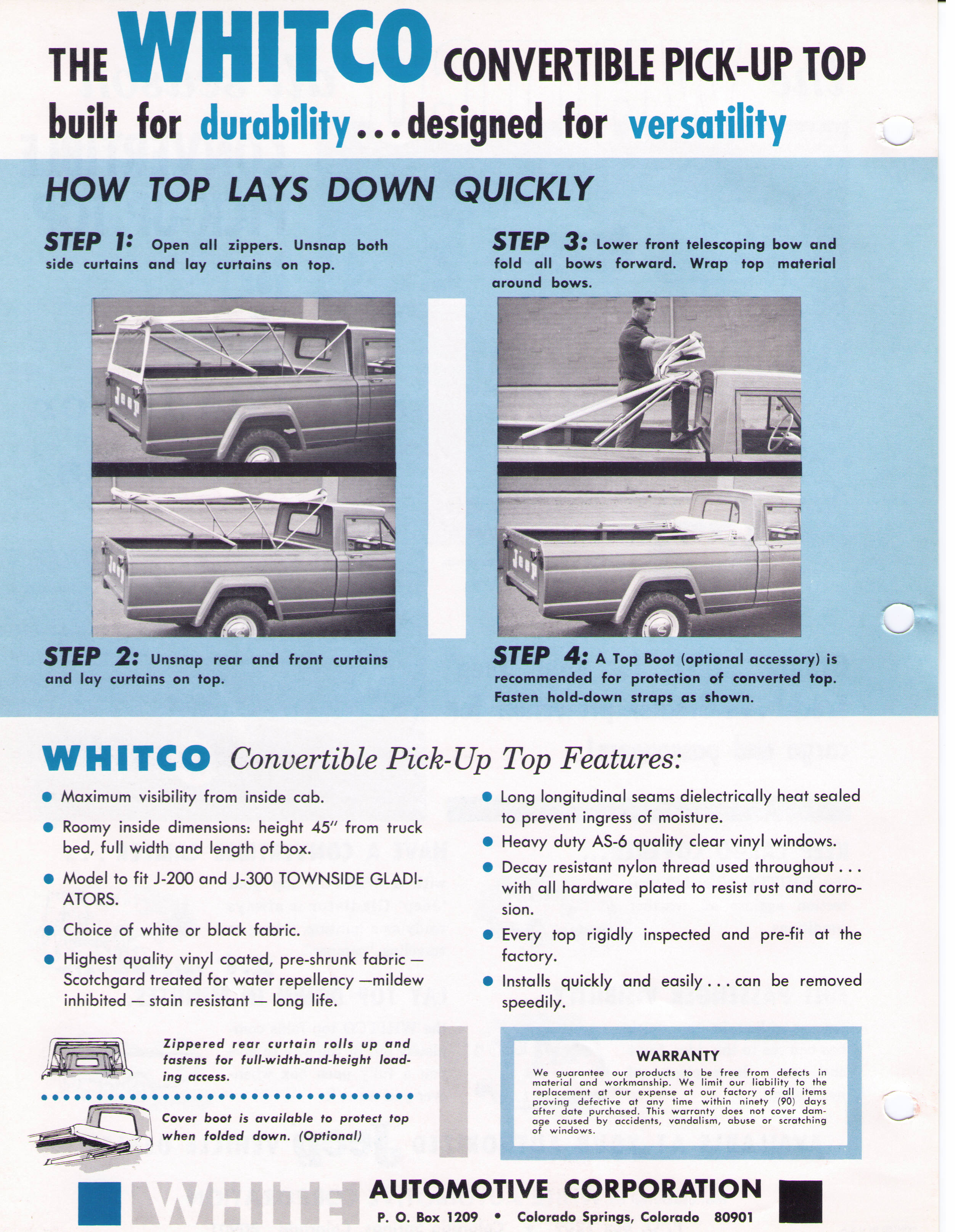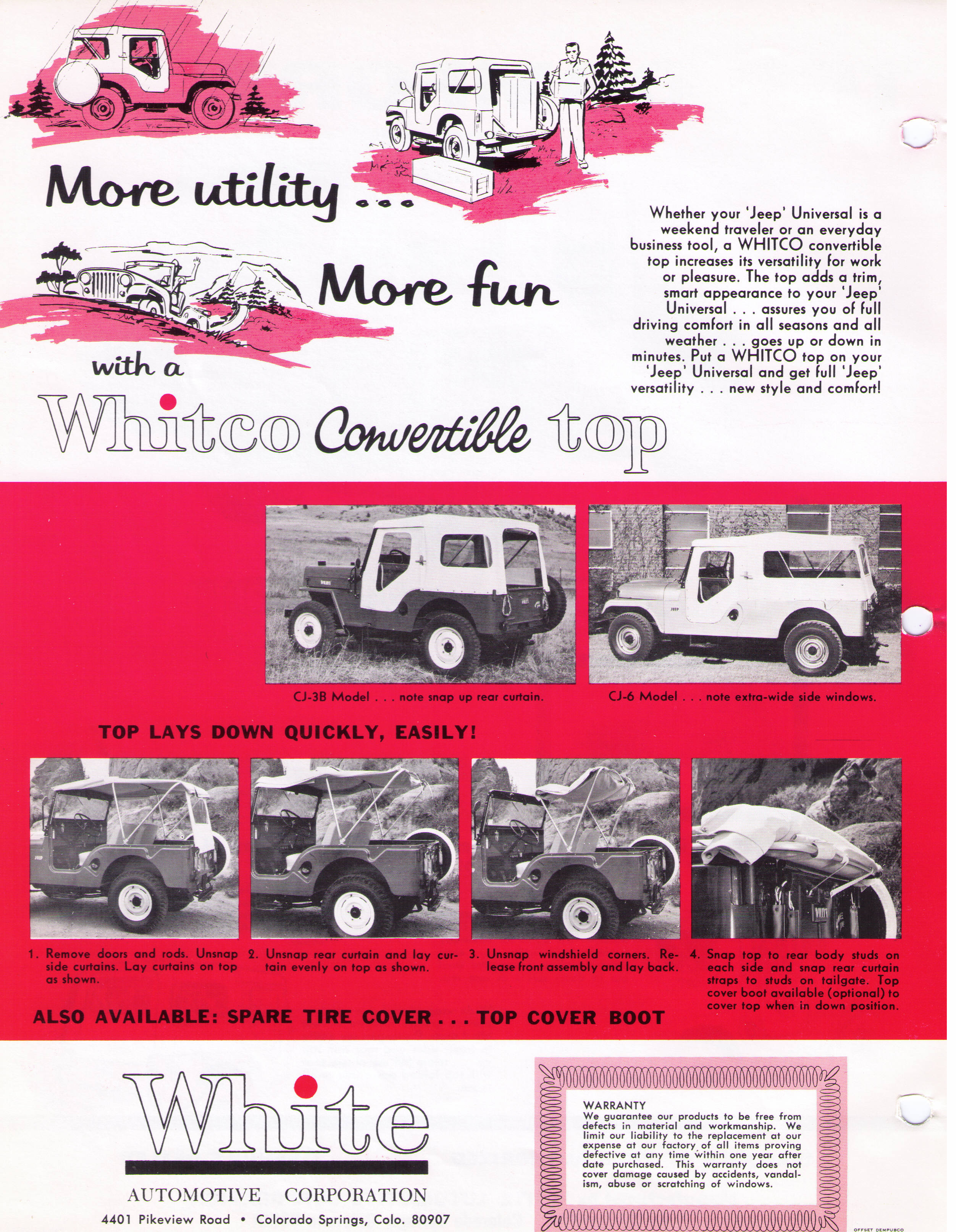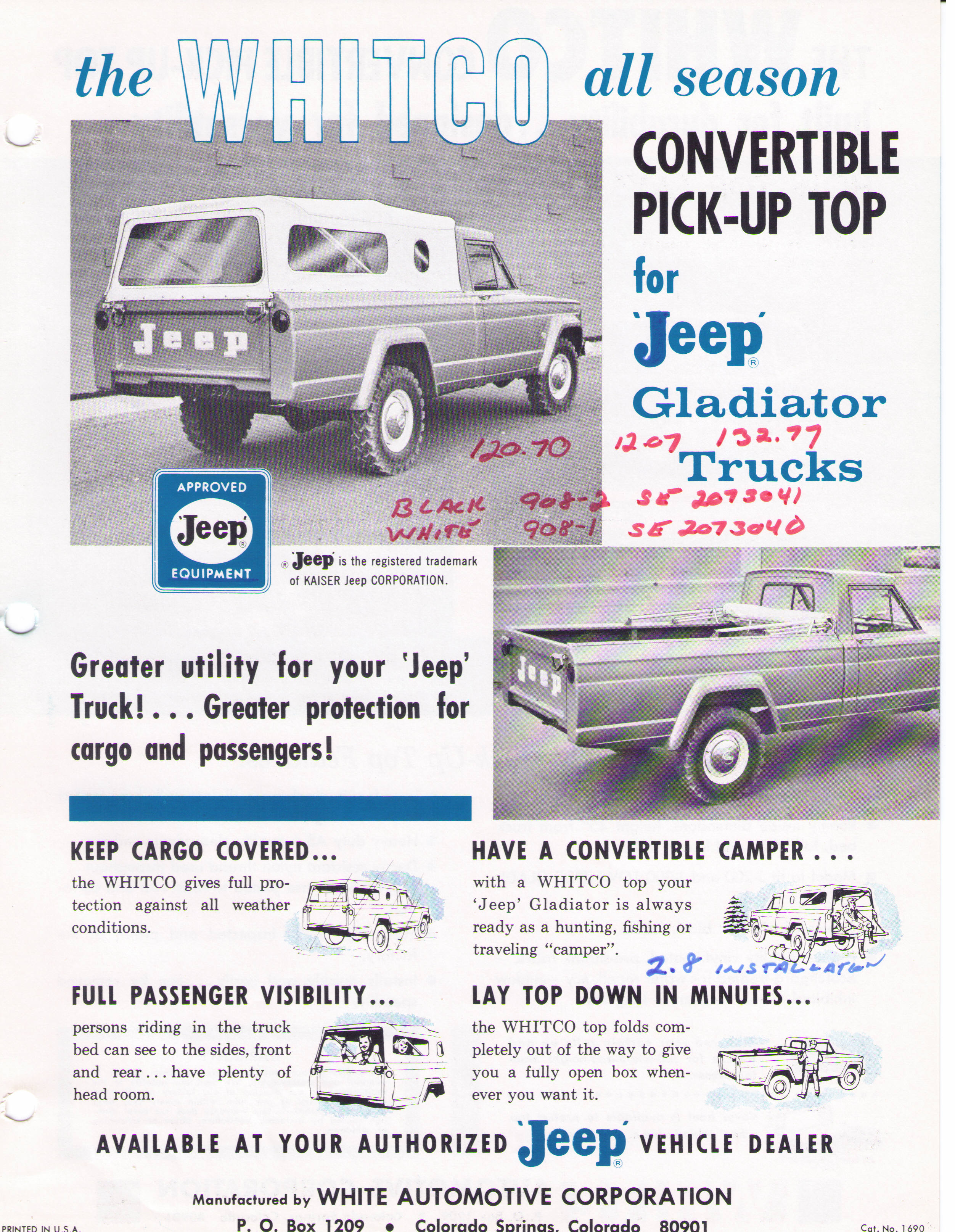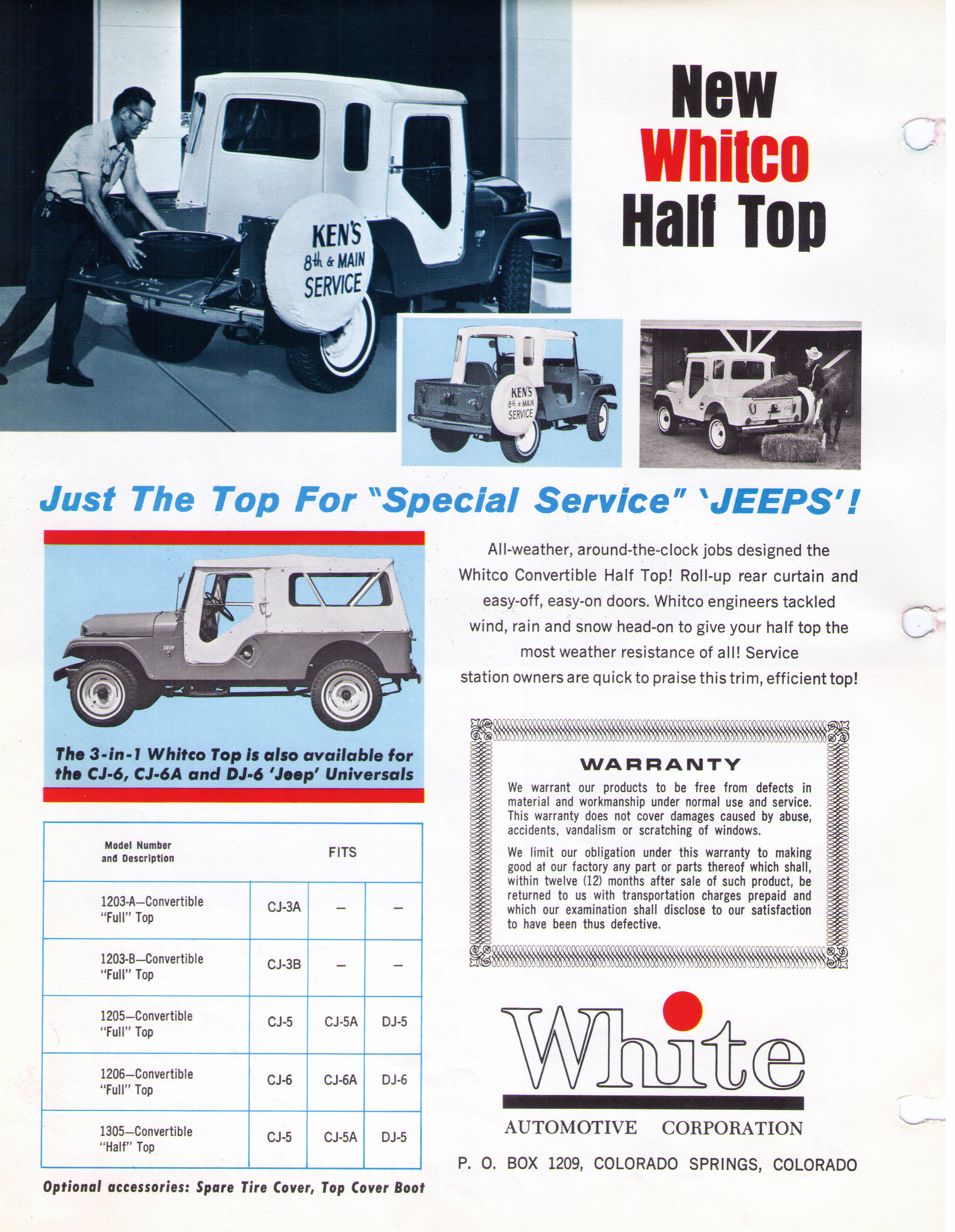 Here is two set of sheets about the White Automotive Corporation (Whitco) Soft top. It listed also the bikini top, half top and convertible top for the CJ-5.